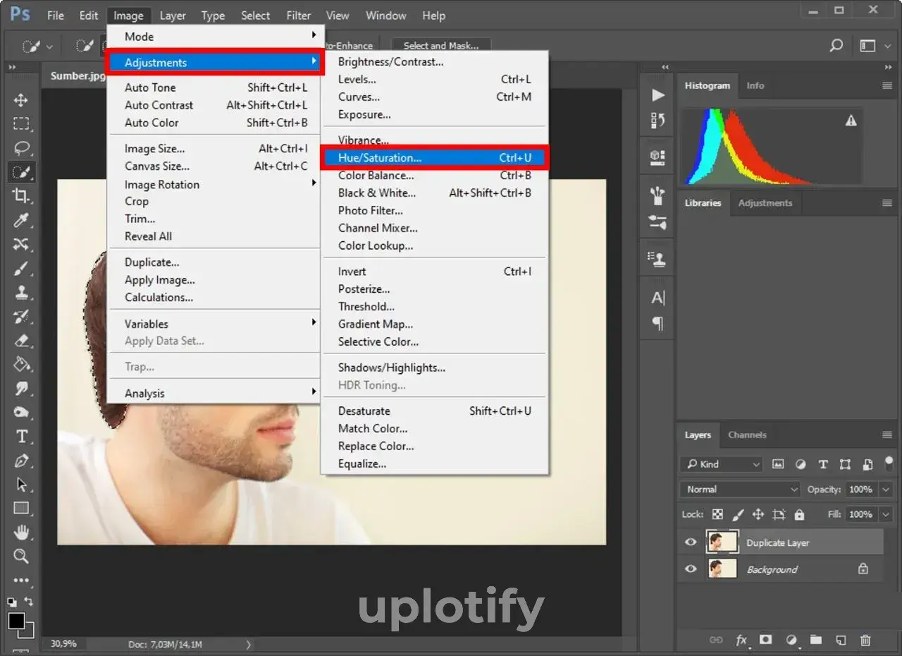 - Pertama, klik tab Image, lalu pilih Adjustments, dan klik Hue/Saturation.