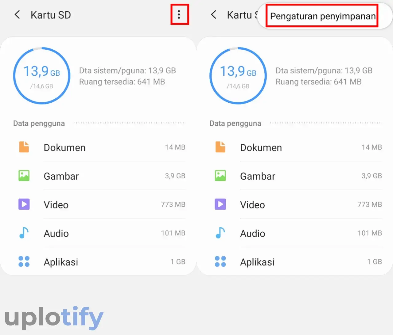 4. Klik icon titik 3 dan pilih Pengaturan Penyimpanan.Pilih Pengaturan Penyimpanan Kartu SD