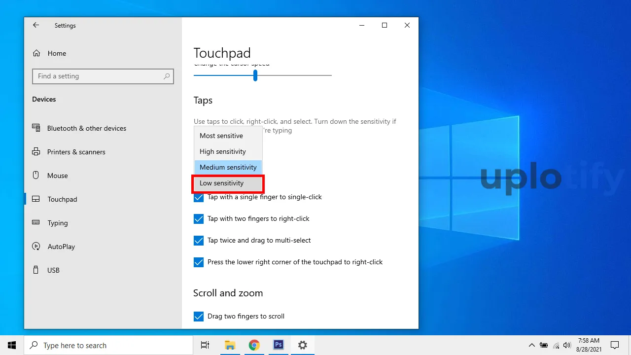 - Masuk ke tab Touchpad dan ubah touchpad sensitivitynya menjadi Low sensitivity.